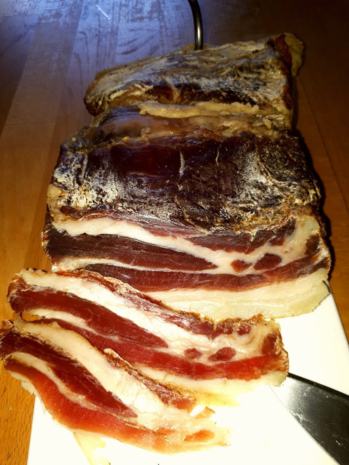 After hanging for 3 weeks it was ready for a first test. Tasted just wonderful. Give it some more time and it will taste even better but gets dryer and more difficult to cut the longer it hangs. You just try what u prefer works for u.